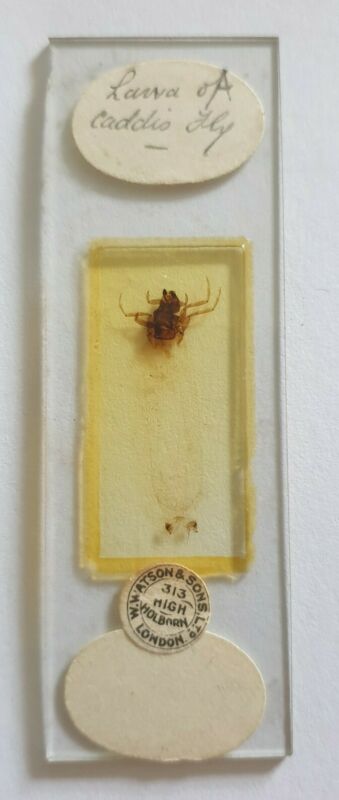 Title (ebay affiliate link): VERY FINE ANTIQUE WHOLE INSECT MICROSCOPE SLIDE LARVA OF CADDIS FLY BY WATSON