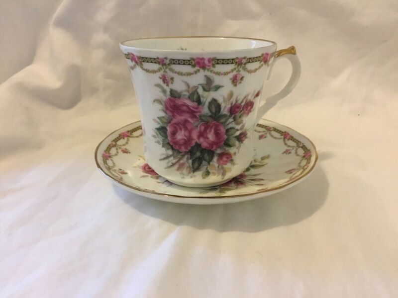 Allyn Nelson Fine Bone China Tea Cup & Saucer Pink Roses W/Gold Trim