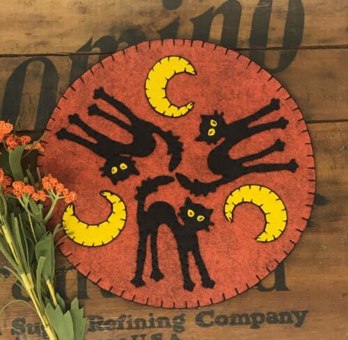 Primitive Stitchery HALLOWEEN Black CATS & Moon Penny Rug ~ FALL Candle Mat