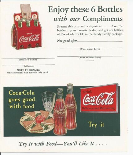 Title (ebay affiliate link): COMPLIMENTARY DRINK COCA-COLA SALESMAN''S COUPON "GOES GOOD WITH FOOD"