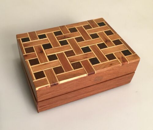 Title (ebay affiliate link): Vintage Inlaid Wood Trinket Box Multi Color Wood Basket Cross Weave Inlay