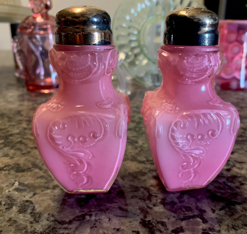 Title (ebay affiliate link): Antique Consolidated Glass Pink Opaque Narrow Based Scroll Salt&Pepper Shakers