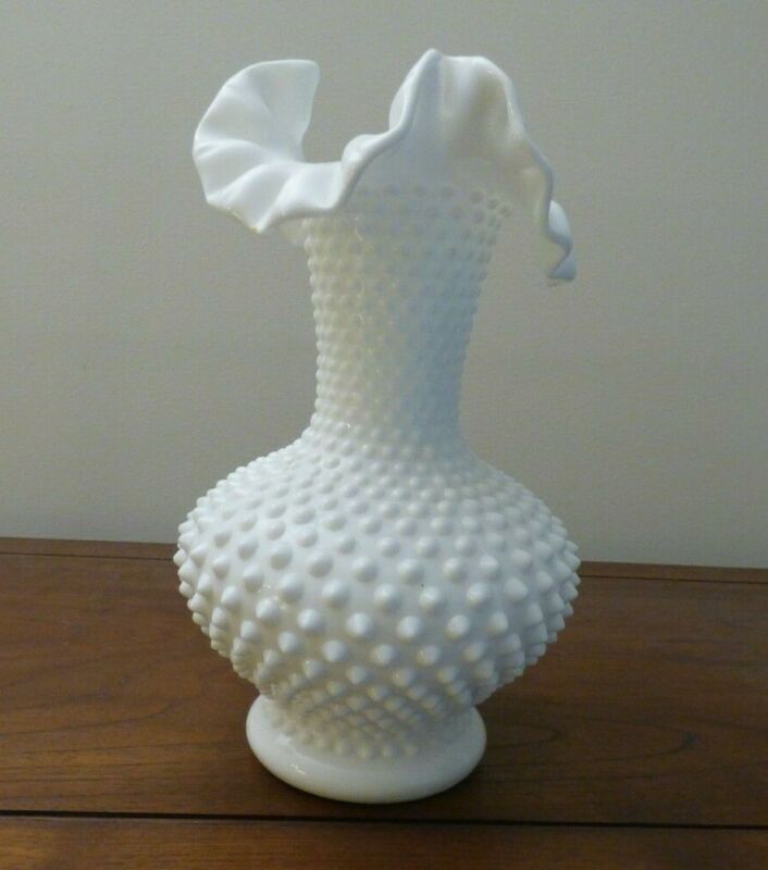 Title (ebay affiliate link): Vintage Fenton Hobnail Ruffled Crimped White Milk Glass Vase 3752 10.5"