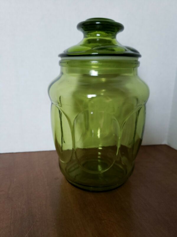 Title (ebay affiliate link): Vintage L.E. Smith Green Depression Glass Apothecary Jar Canister w/ Lid