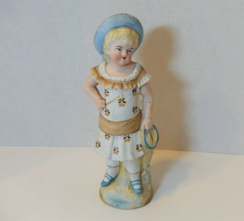 Antique German Bisque Victorian Figurine Girl w/ Hoop & Stick Piano Baby