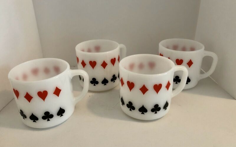 LOT 4 vtg FEDERAL milk GLASS mugs poker card suits DIAMOND HEART SPADE CLUB