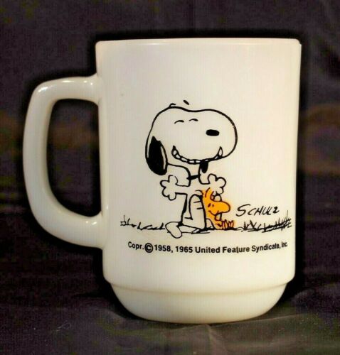 Title (ebay affiliate link): Snoopy hugging Woodstock "This has been a good day!" Fire King milk glass mug