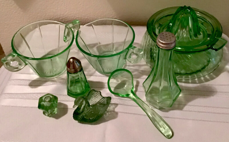 Title (ebay affiliate link): Vintage depression glass green Lot-pepper Salt Milk Sugar Reamer Ladle Swan Etc.