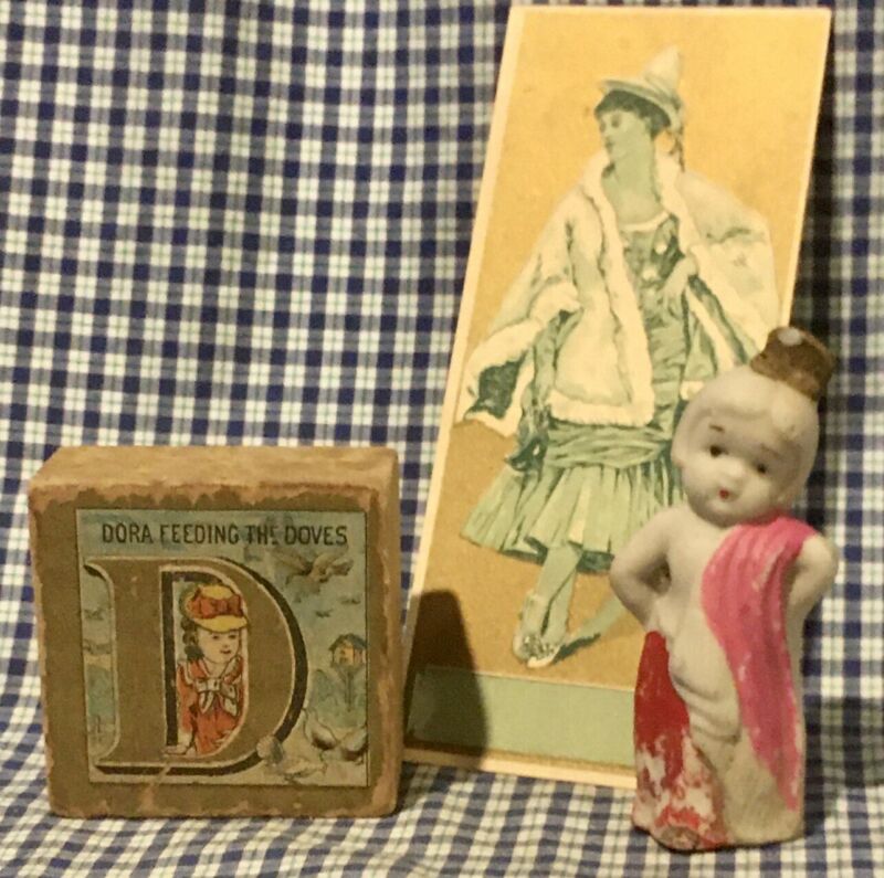 Victorian illus Litho ABC Toy Wood D Block & Antique Small Bisque Doll / Ad Card