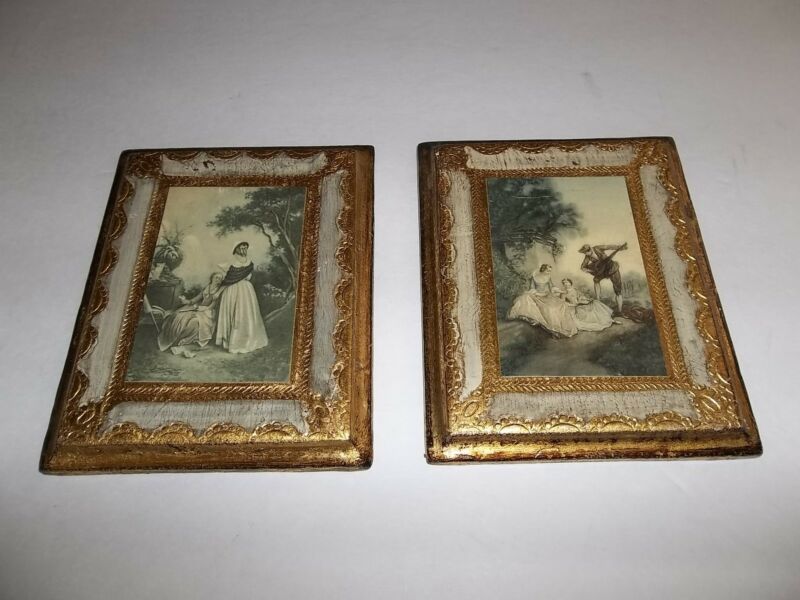 STUNNING ANTIQUE LITHOGRAPH PRINTS COLONIAL WOMEN IN GARDEN (2) WALL DECOR ITALY