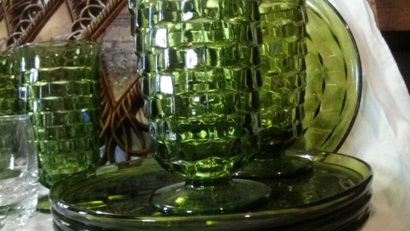 Title (ebay affiliate link): Indiana Cubist Cube Whitehall Green 6" Iced Tea Glasses Tumblers with plates 8pc