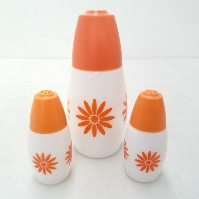 Title (ebay affiliate link): VTG Gemco Westinghouse Milk Glass Salt/Pepper/Sugar Shakers Orange Daisy