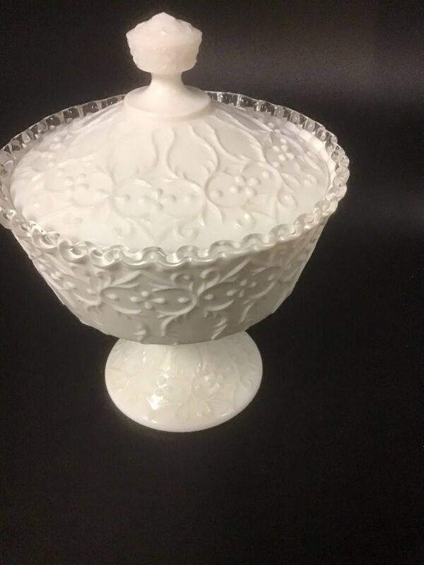 Title (ebay affiliate link): Fenton Silver Crest Spanish Lace Covered Compote Candy Dish Milk Glass