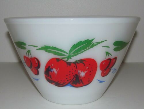Title (ebay affiliate link): Fire King Apples and Cherries 9.5" Splash Proof Milk Glass Bowl EUC