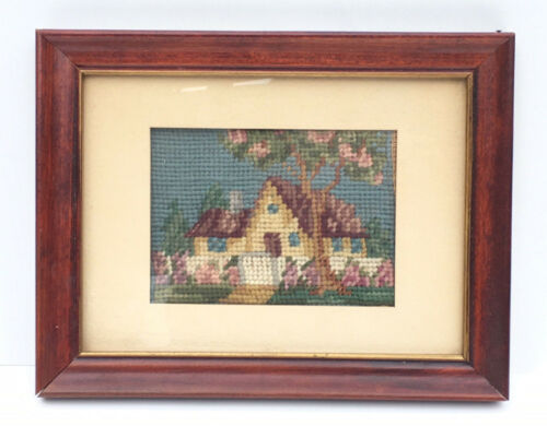 Vintage Needlepoint Picture in Frame of Cottage House