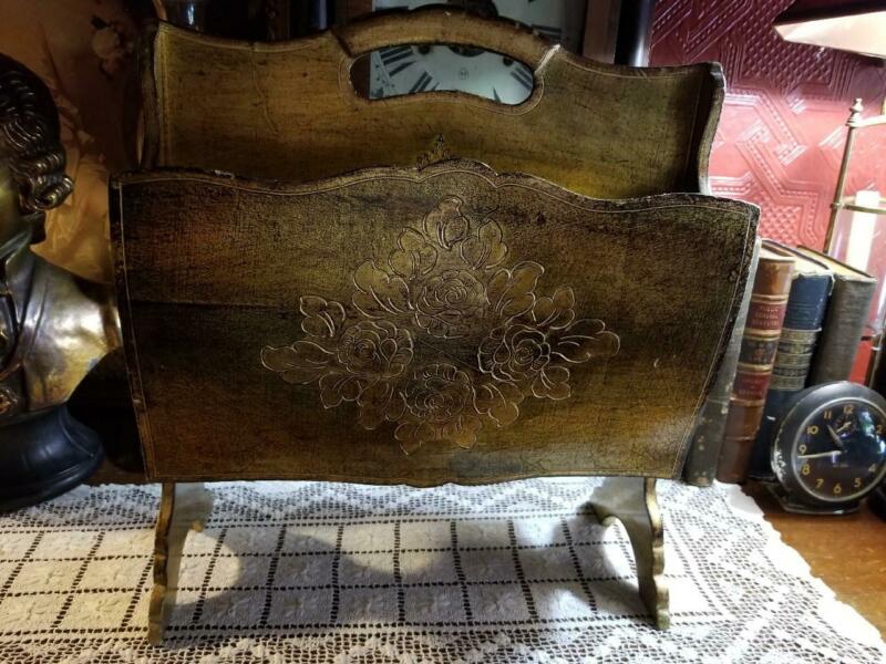 Title (ebay affiliate link): Vtg MCM Florentine Folk Tole Gold Painted Wood Magazine Holder Hollywood Regency