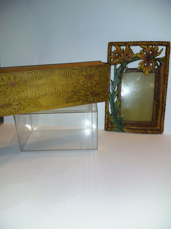 ANTIQUE WOODEN BOX~FLEMISH ART~PYROGRAPHY~GLOVES~FRAME
