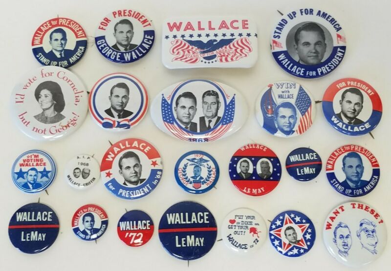 Title (ebay affiliate link): 23 Vintage 1968 & 1972 George Wallace Presidential Campaign Pinback Buttons