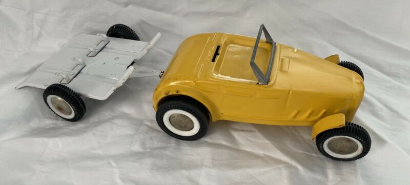 Title (ebay affiliate link): Vintage Buddy L Yellow Hot Rod Roadster w/ trailer, Pressed Steel Toy Car