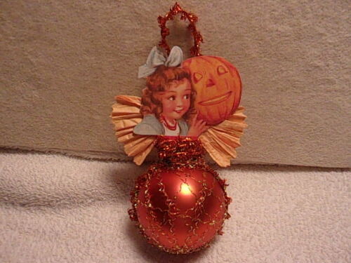 Title (ebay affiliate link): Antique Look HALLOWEEN Ornament, GIRL-Pumpkin SCRAP, Glass,Tinsel, Handmade