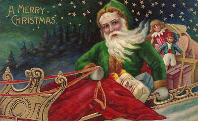 Santa Claus PC. Green Suit, Two dolls in back Sleigh