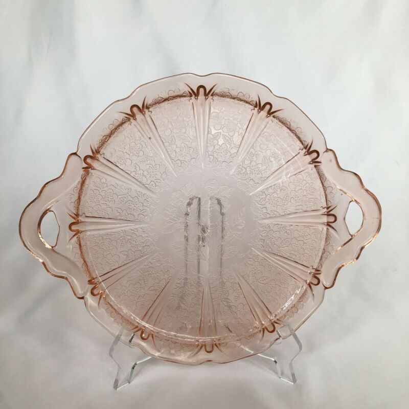 Title (ebay affiliate link): Jeannette Cherry Blossom Pink Depression Glass Open 2 Handle Round Tray
