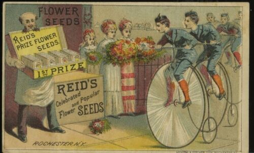 Title (ebay affiliate link): Vintage Reid''s Prize Flower Seeds High Wheel Bicycle Race Victorian Trade Card