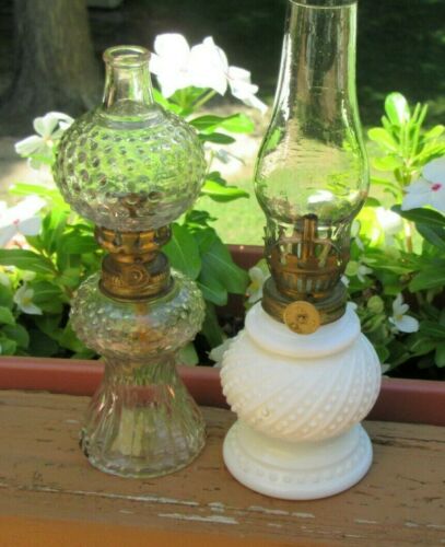 Title (ebay affiliate link): 2 Vintage/Antique Miniature Oil Kerosene Lamps Milk Glass and Clear Hobnail