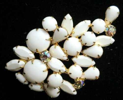 Title (ebay affiliate link): Large Modern Abstract WHITE MILK GLASS VINTAGE RHINESTONE BROOCH
