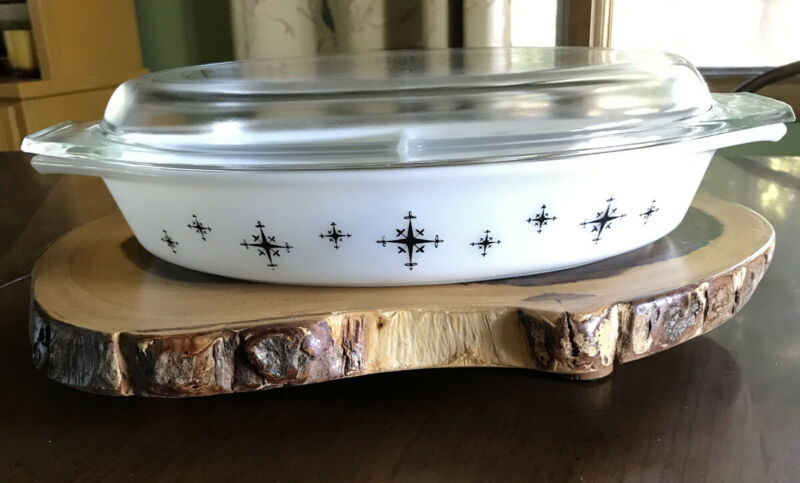 Title (ebay affiliate link): Pyrex 1959 White Milk Glass Divided Casserole Dish With Lid Black Compass 1.5qt