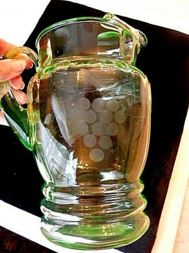Title (ebay affiliate link): Green Depression Glass Water Pitcher etched Grapes ringed bottom 10" ice lip