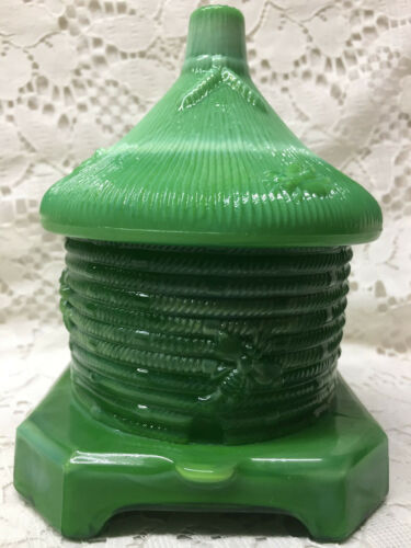 Green Milk Jadeite glass honey pot bee hive jar storage Opaque Slag / swirl art