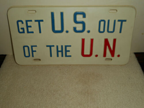 Title (ebay affiliate link): Get U.S. Out Of The U.N. Vacuum Formed Novelty License Plate Political Sign