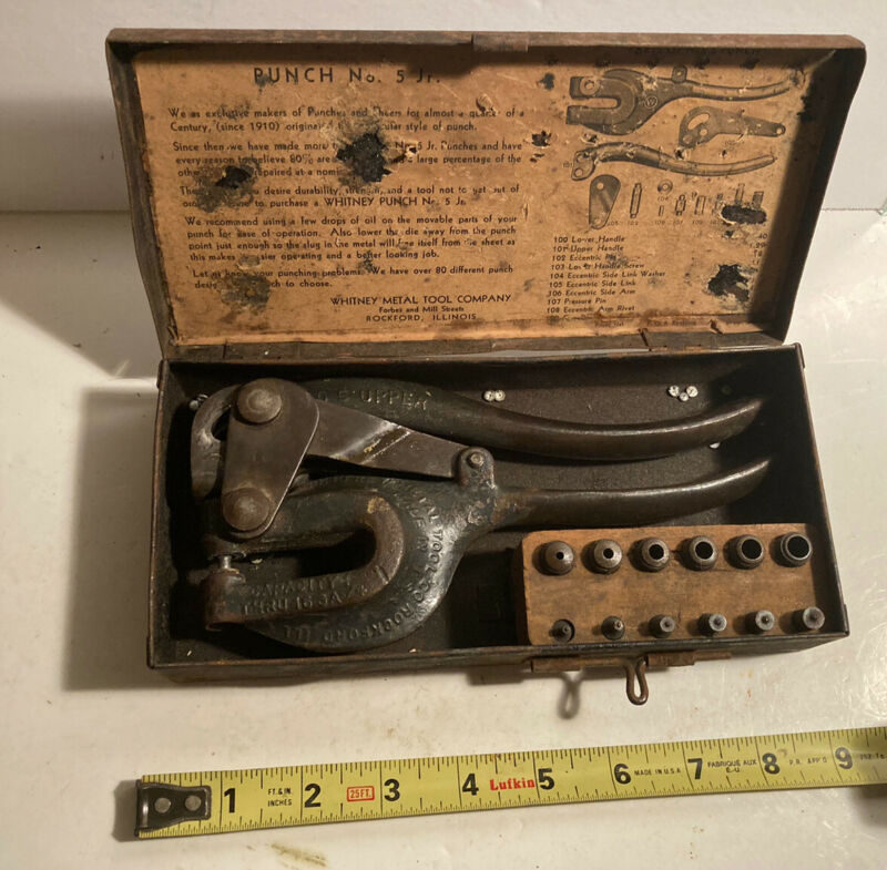 Title (ebay affiliate link): Antique Vintage WHITNEY No 5 Sheet Metal Punch Set Complete In Box VG Tool