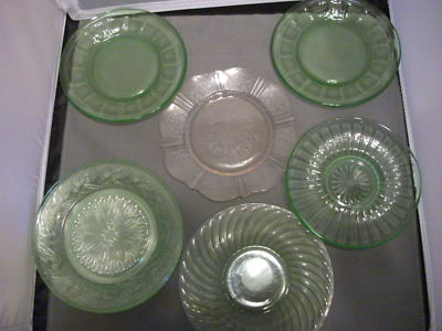 Title (ebay affiliate link): 7 Green/1 Pink Depression Glass Small Plates/Saucers