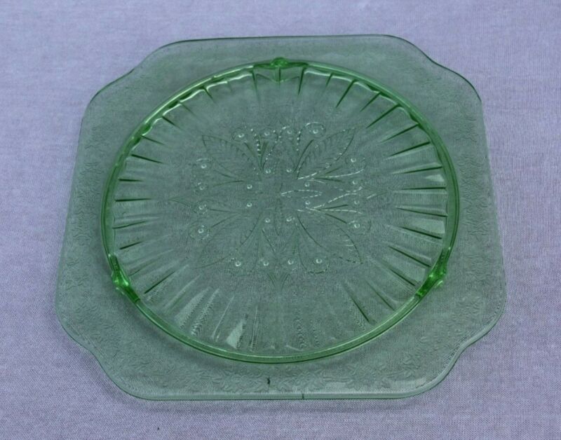 Title (ebay affiliate link): VINTAGE JEANNETTE GREEN DEPRESSION GLASS SQUARE 10" FOOTED CAKE PLATE