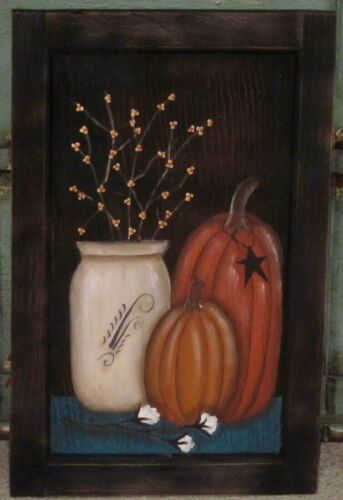 *~*PRIMITIVE*~* HP FOLK ART PRIM PUMPKINS * CROCK * BITTERSWEET *~* DOOR PANEL