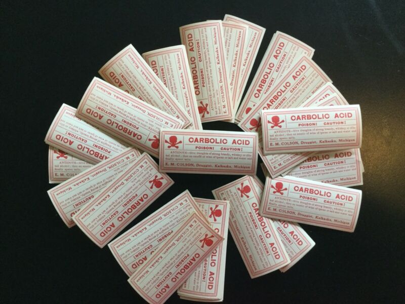 50+ Vintage Pharmacy Drug Store CARBOLIC ACID POISON LABELS - early/mid 1900''s