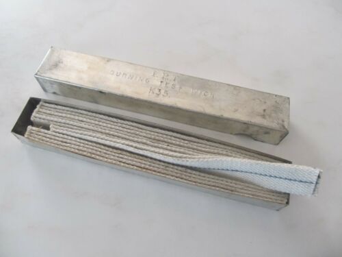 12 VINTAGE HURRICANE LAMP WICKS, IN A METAL BOX.