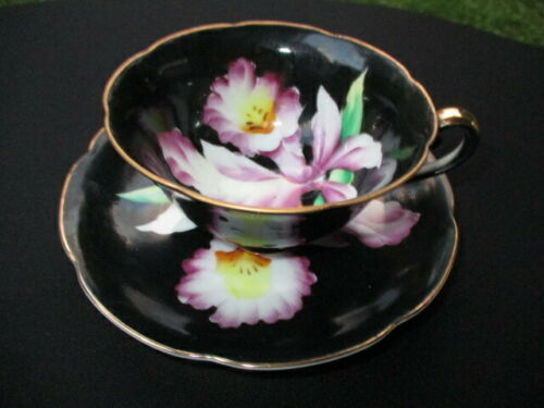 CUP SAUCER JAPAN HAND PAINTED PURPLE ORCHIDS MIDNIGHT BLACK FIELDS