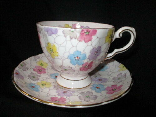 CUP SAUCER TUSCAN PINK CHINTZ PASTEL ANEMONE FLOWERS PINK LILAC BLUE YELLOW
