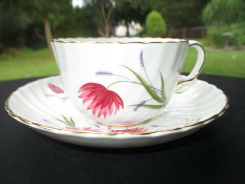 CUP SAUCER ADDERLEY SWIRL RIB CRANBERRY WINE CONEFLOWERS PURPLE SPRIGS
