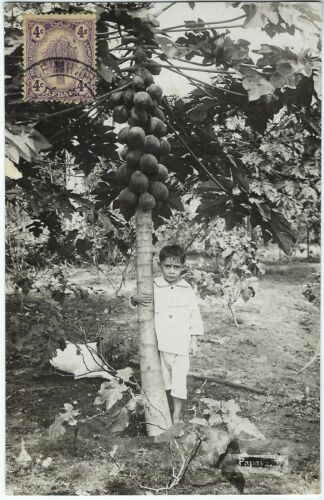 Title (ebay affiliate link): Malaya Kedah photographic card of boy under Papaya tree stamped, unposted