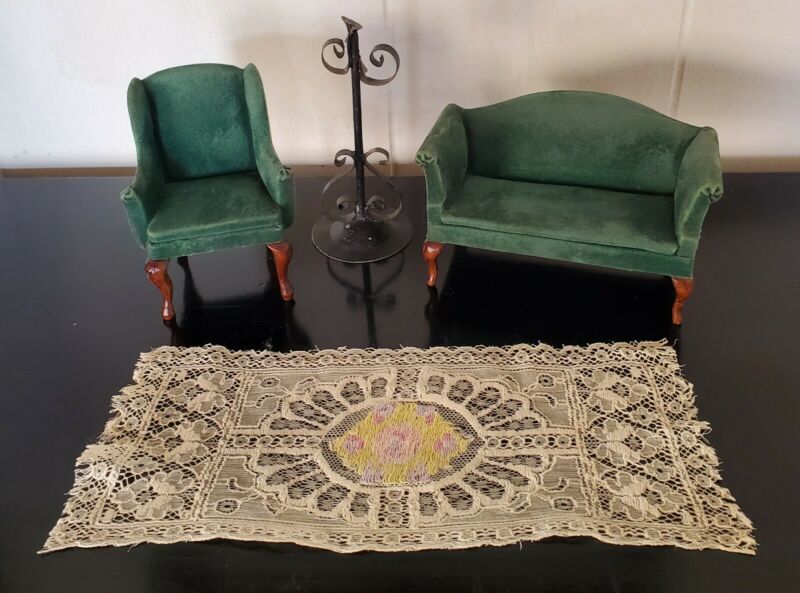 Title (ebay affiliate link): Vintage Antique Dollhouse Furniture 1:12 Lot Velvet Sofa and Chair Iron Coatrack