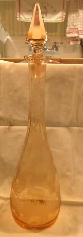 Title (ebay affiliate link): Antique Pink Etched Glass Decanter Deer Woodland Scene 16" Tall Very Good Condit