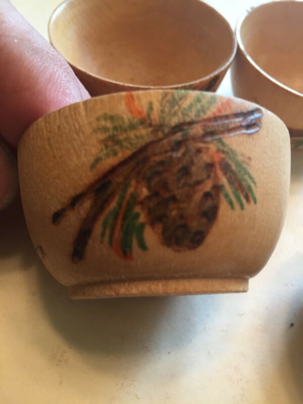 Title (ebay affiliate link): 4 Vintage Miniature Wooden Bowls With Pine Cone Print Looks Hand-Painted