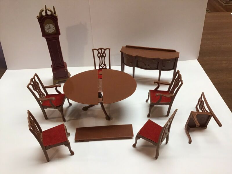 Title (ebay affiliate link): Marx DINING ROOM TABLE, CHAIRS, BUFFET, CLOCK Dollhouse Furniture 1:16