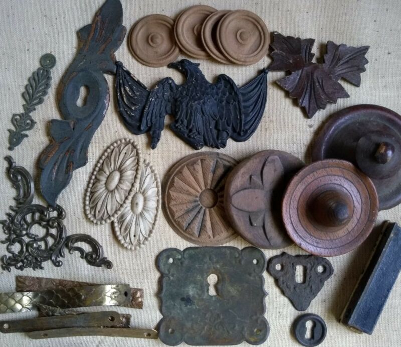 Title (ebay affiliate link): Antique Vtg Lot 24 Furniture Applique Decorations Wood Eagle Key Holes Crafts