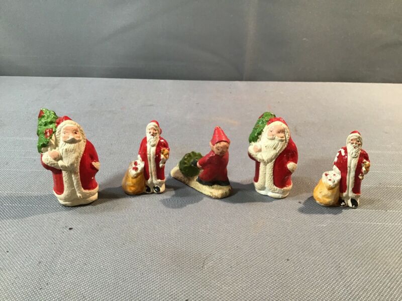 Set 5 Antique Santa Christmas Figurine Mini England Bisque Or Compo