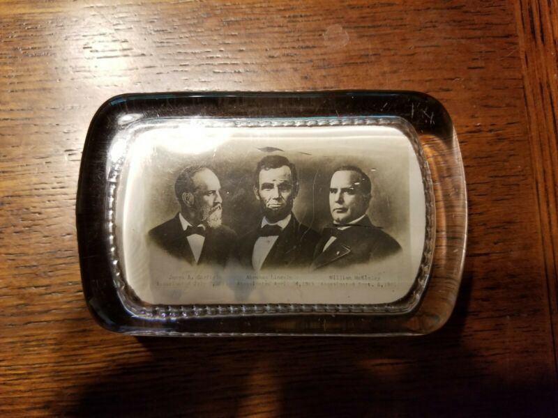 Title (ebay affiliate link): Paperweight In Memoriam Of Assasinated Presidents, McKinley, Lincoln & Garfield